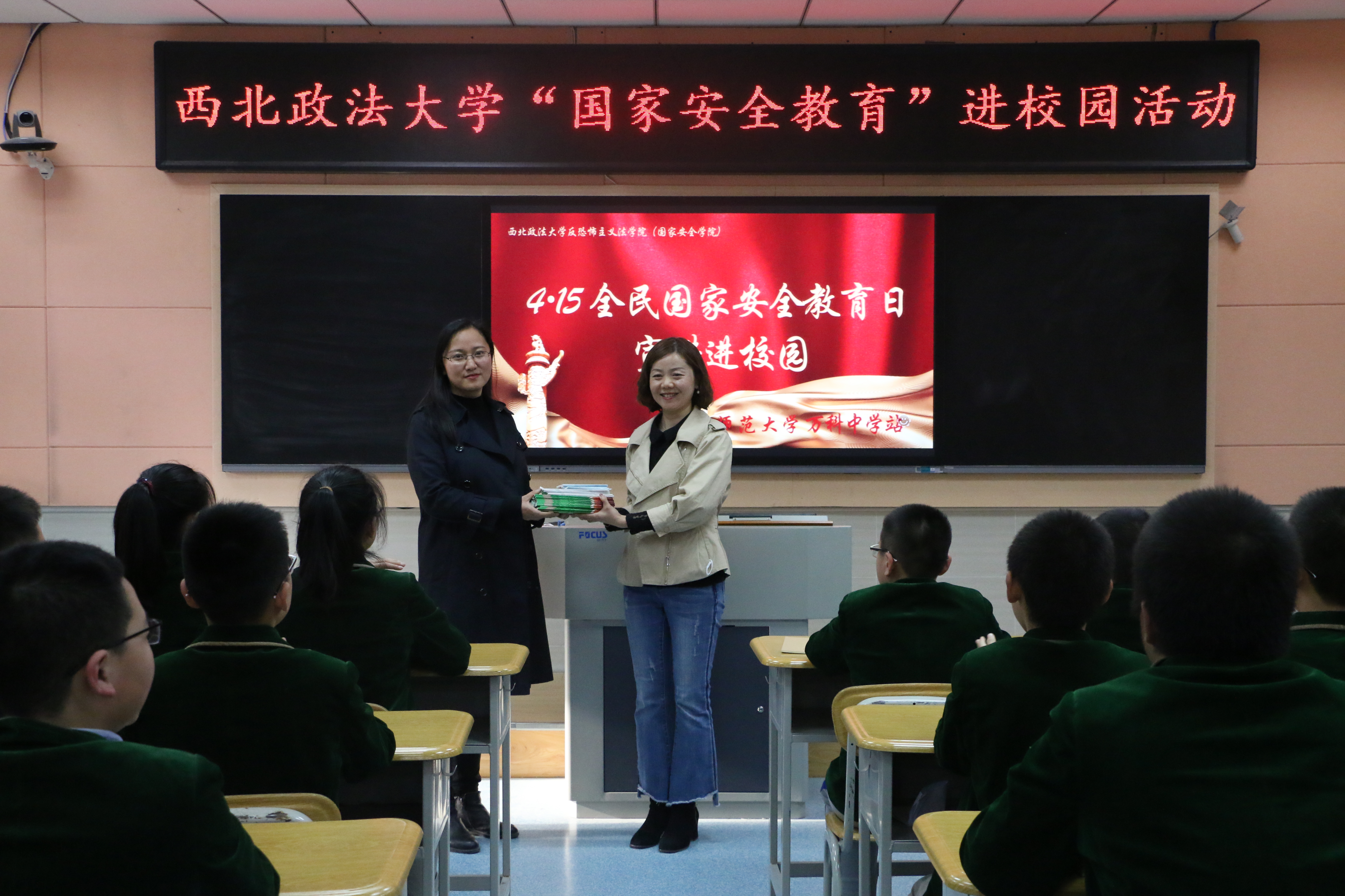 反恐怖主义法公司党委副书记侯颖怡代表学院向陕西师范大学万科中学赠送国家安全知识读本。