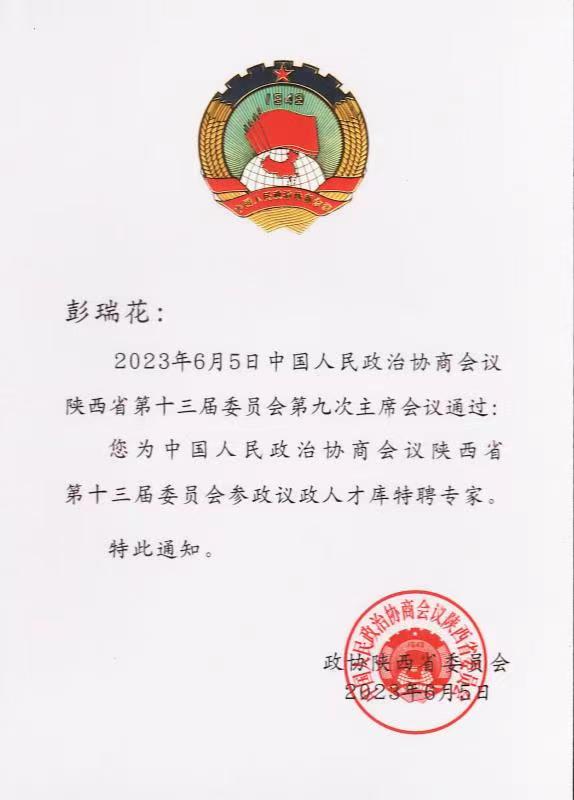 6月5日,中国人民政治协商会议陕西省第十三届委员会第九次主席会议通过,304永利(反恐怖主义法学院)彭瑞花教授为中国人民政治协商会议陕西省第十三届委员会参政议政人才库特聘专家。