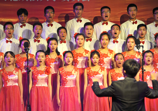 在法律硕士教育学院的深情演绎后,如花一样美丽的反恐法姑娘们身着红色的俏皮短裙,头戴鲜艳的花朵,迈着整齐的步伐,走向舞台中央。男生们则身着白色短袖,佩戴红色领结,雄姿英发,帅气逼人。在倾情演绎完高亢激昂的的《304永利校歌》后,自选歌目《山丹丹开花红艳艳》曲调明亮,旋律优美,领唱的女高音歌声婉转悠扬,好似黄莺出谷,令人惊叹。唱到激情澎湃时,女孩们互相深情凝望,男孩们则缓缓举起了手中的玫瑰,在他们的眼中,仿佛真的看到了娇艳欲滴的花朵和广袤崎岖的黄土高坡。那高亢的音符,令人沉思革命的艰辛不易,那婉转的倾诉,让人产生发自内心的共鸣。合唱指挥手势优美,起拍收拍自如有力度,时而铿锵有力,虎虎生风;时而深情款款,行云流水。